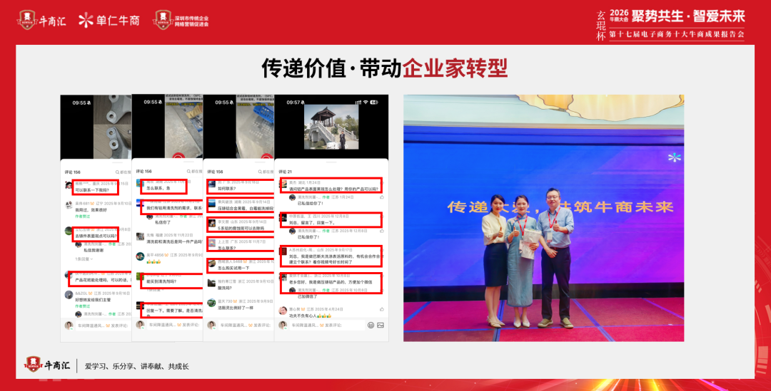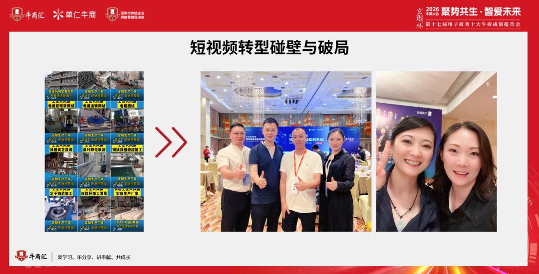 2025 年 9 月,做工业清洗剂的博莱富尔化工刘张勇学长开心地跟我说:“蕾姐,我愁坏了,一条视频爆了,一天 200 多条询盘,根本接不过来!”还有做 LDS 及 3D-MID 的丰景拓毛利坚学长,原先产品单一、客户外流,通过互联网营销,成功与国内知名机器人公司、华为、小米等企业合作,甚至进入军工、航空领域,参与世界最新产品的技术研发,实现了质的飞跃。看到同学们实实在在的增长,我由衷地为他们感到高兴。这几年,我们从夫妻同修,走到团队同修。坚持每年带团队复训、参加帮扶班、参加牛商争霸赛、扒皮师培训、企业互访等活动。遇到困惑了就主动找解决方法,甚至就连单仁老师、朱依静老师等大咖的吃饭时间、赶飞机的路上我们都不放过,主动向各位老师请教,解决企业不同阶段的问题。在我看来,单仁牛商不只是教我们做短视频,他是陪伴我们企业从战略到落地、从流量到变现、从个人到组织的全链路营销增长伙伴。