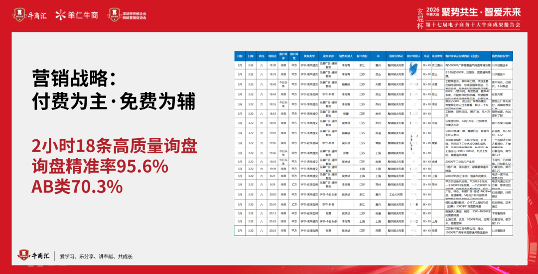 我们深度拆解客户痛点,按行业、规模、决策人画像分类梳理,持续升级降温系统,开展专业培训,打造专家型工程师团队,只为实实在在帮客户解决车间环境问题,把对员工的关怀落到实处,与客户共建幸福企业。经过不断优化,我们确立了 “免费+付费” 的营销策略。如今投放优化后,2小时内就能收获 18 条精准询盘,询盘精准率更是高达95.6%,AB类占70.3%。线上营销让我们真正实现了精准获客、高效转化。