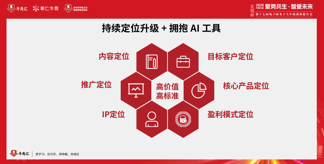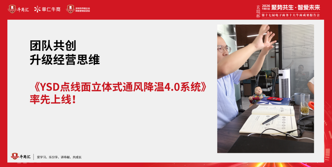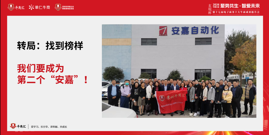 正所谓,淋过雨,所以想为更多人撑伞。我愿意继续站出来分享、赋能,帮助更多传统企业成功转型,与大家共学共成长,把在牛商这个大家庭收获的爱与力量,持续传递出去。回顾这五年,懿晟德能一步步成长,核心就是不断优化定位、清晰方向、坚定执行。如今整个行业都在向整体解决方案转型,作为先行者与推动者,我们倍感自豪。未来竞争或许会更加激烈,但我们毫不畏惧,因为我们坚信:我们是未来的创造者!我们将继续为行业、为中国制造业贡献自己的力量。最后,我要由衷感谢一路陪伴、支持、赋能懿晟德的每一位朋友和伙伴,没有你们,就没有今天的懿晟德,谢谢大家!我也相信,我们所有企业都能借助互联网全域营销,实现业绩最大化,把生意做得越来越稳、越来越好!我的分享到此结束,祝各位领导、各位牛商家人们身体健康、事业兴旺、心想事成!谢谢大家!